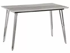 Kohota sisustustasi tällä tyylikkäällä ruokapöydällä, joka hurmaa kaikki vieraasi. Helposti puhdistettavasta MDF-levystä valmistettu pöytälevy on viimeistelty upealla marmorikuvioinnilla, joka antaa pöydälle ylellisen ilmeen. Hopeat, kiiltävät rautajalat takaavat vakauden, kun taas kumiset pehmusteet suojaavat lattiaasi naarmuilta. Muotoilunsa ja kuviointinsa ansiosta pöytä näyttää erityisen hyvältä moderneissa ja glamour-tyylisissä sisustuksissa.