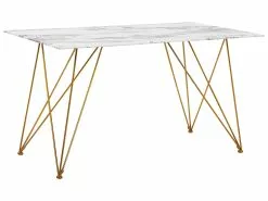 Päivitä ruokailutilasi tai keittiösi ilmettä tällä glamour-tyylisellä ruokapöydällä. Valkoisella marmorikuvioinnilla viimeistelty karkaistu lasitaso ja kullanväriset metallijalat tekevät pöydästä sekä tyylikkään että käytännöllisen kalusteen, joka tarjoaa mukavasti tilaa jopa neljälle ruokailijalle. Aseta pöydän ääreen sametilla vai vakosametilla verhoiltuja, yhteensopivia tuoleja antaaksesi sisustuksellesi entistä tyylikkäämmän ja ylellisemmän ilmeen.